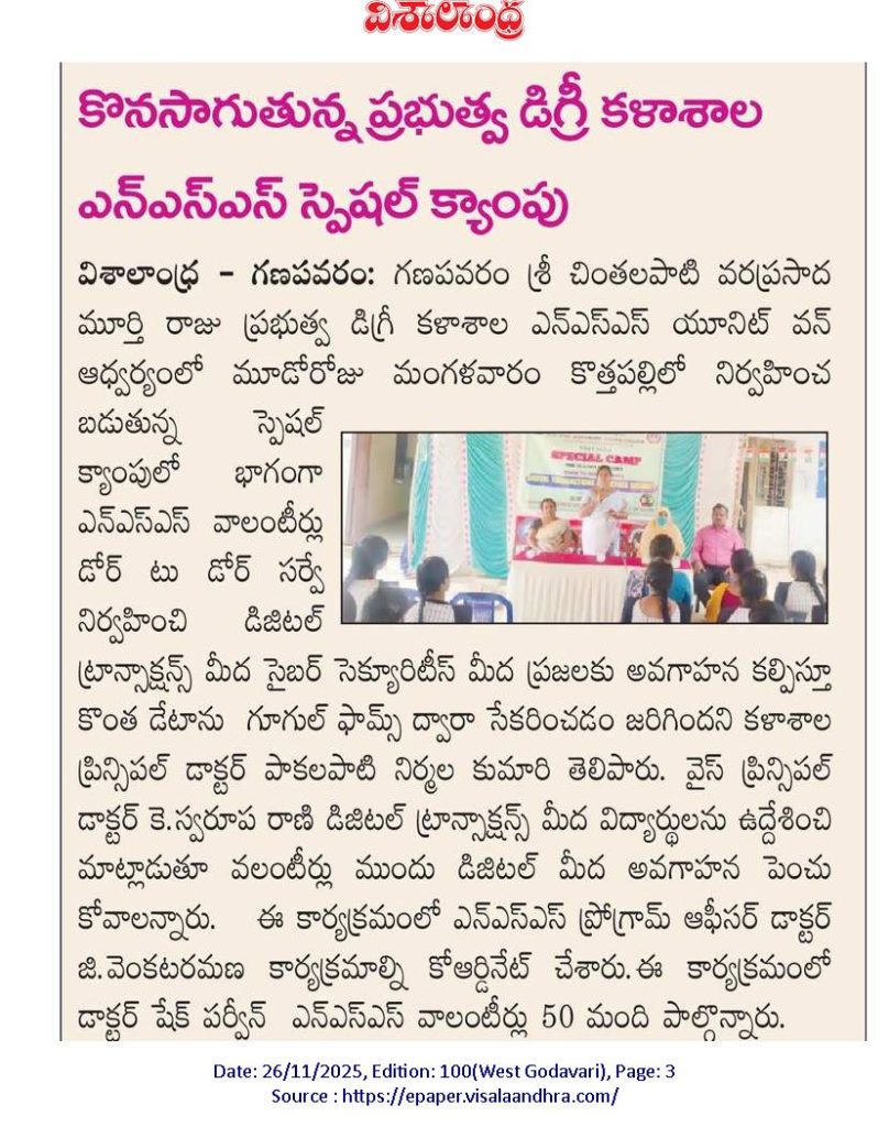 On 25 November 2025, NSS Unit–1 successfully conducted Day–3 of the NSS Special Camp at Kottapalli village by Dr.G.Venkata Ramana, NSS Unit-1 PO. The day’s theme was: