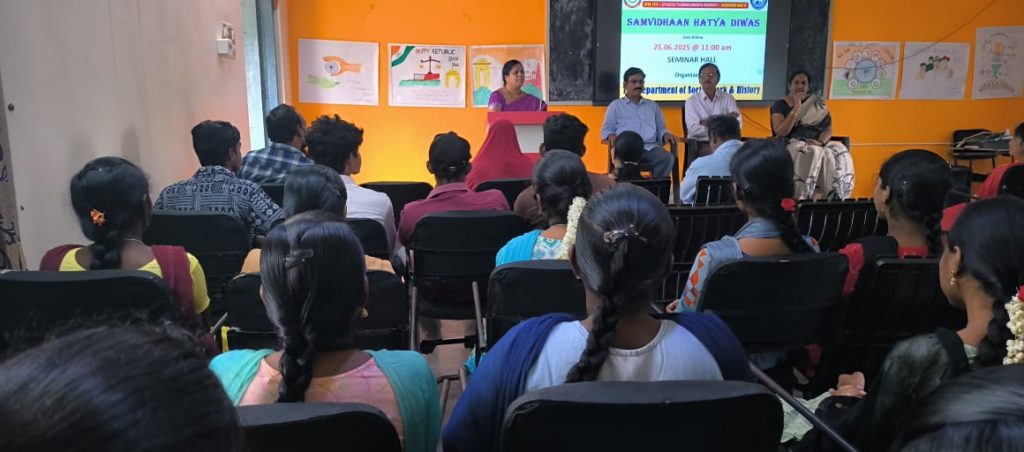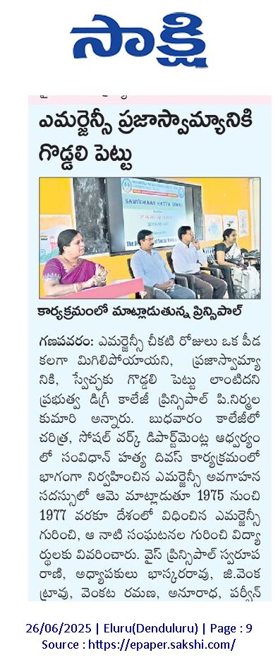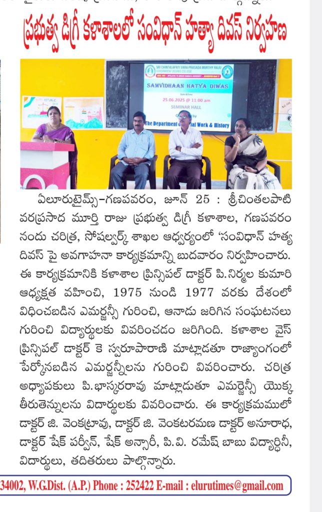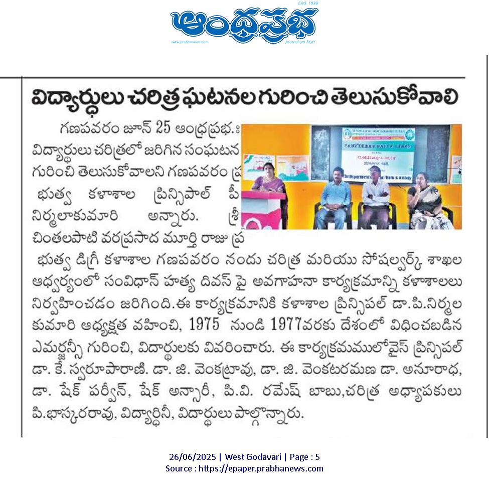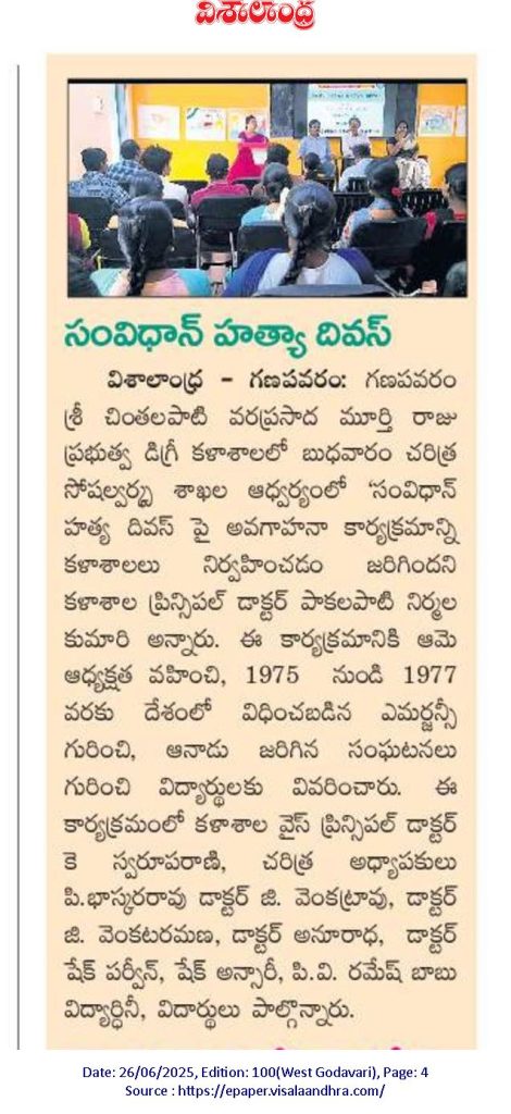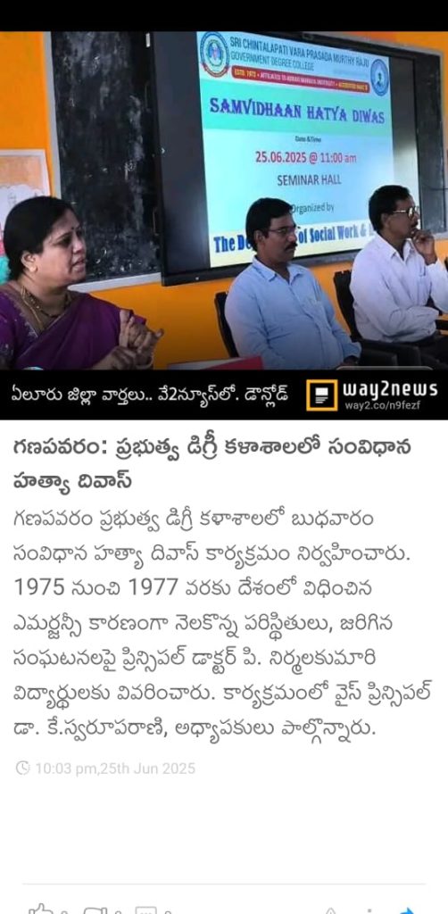 To commemorate Samvidhan Hatya Diwas, the Department of Social Work and the Department of History of S.Ch.V.P.M.R. Government Degree College, Ganapavaram, jointly organized an awareness program aimed at reinforcing the importance of constitutional values and democratic principles.