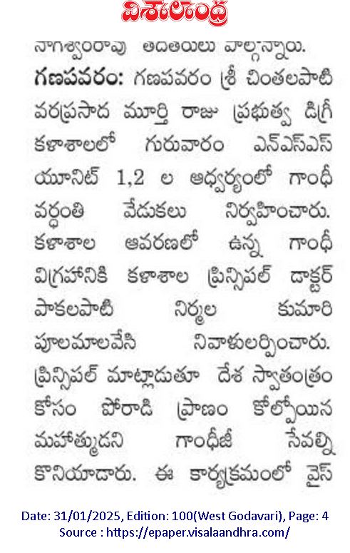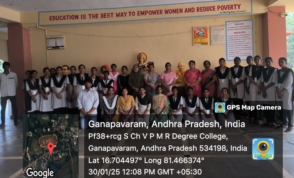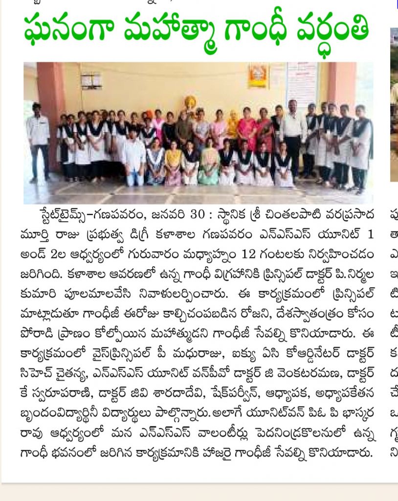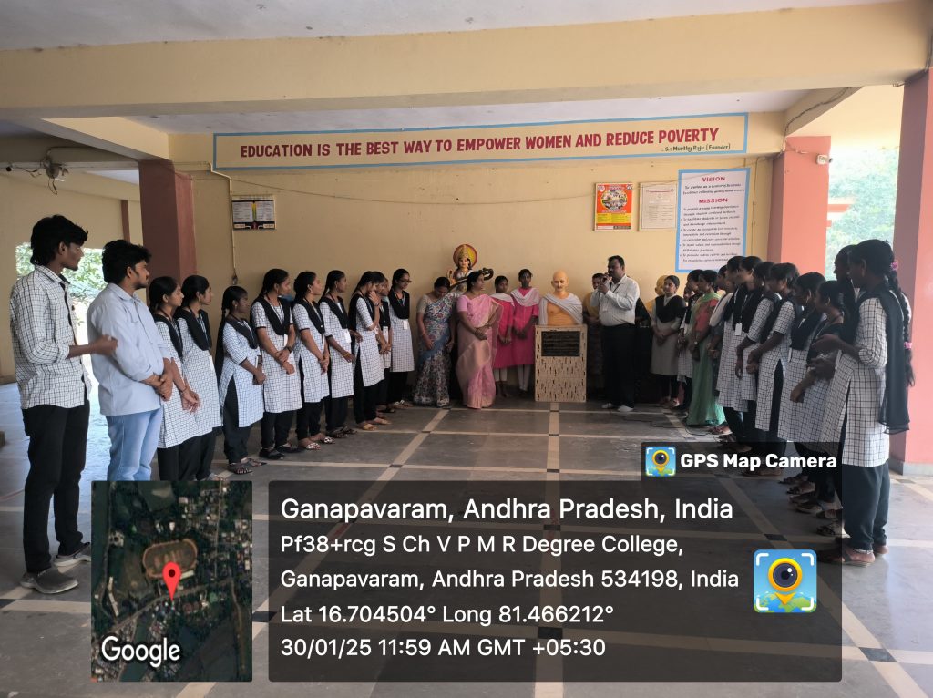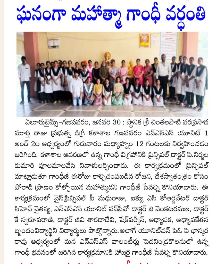 On the occasion of the death anniversary of Mahatma Gandhi, NSS Units 1 & 2 of the college organized a solemn observance to pay tribute to the Father of the Nation. The program was graced by Principal Dr. P. Nirmala Kumari, Vice Principal Sri P. Madhu Raju, IQAC Coordinator Dr. Ch. Chaitanya, NSS Officers Dr. G. Venkata Ramana and Sri P. Bhaskar Rao, along with faculty and students. The gathering reflected on the principles of non-violence, truth, and justice that Gandhiji stood for. Faculty and students participated in a series of activities to commemorate the day and honor his enduring legacy.