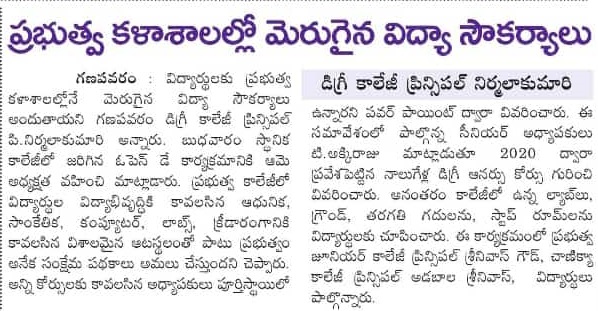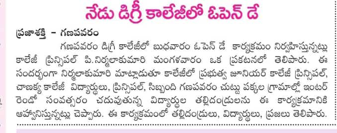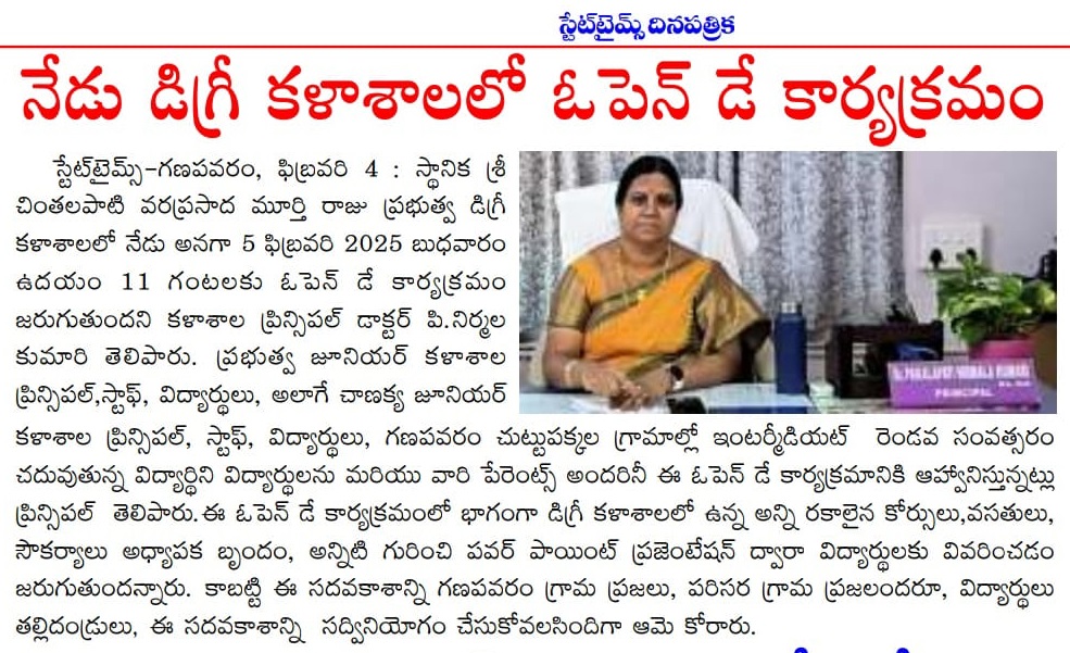 Government Degree College, Ganapavaram, organized an Open Day on 05.02.2025, inviting students and faculty from Government Junior College and Chanakya Junior College, Ganapavaram to explore the campus, academic programs, and facilities. The event aimed to provide aspiring degree students with first-hand exposure to the college environment.