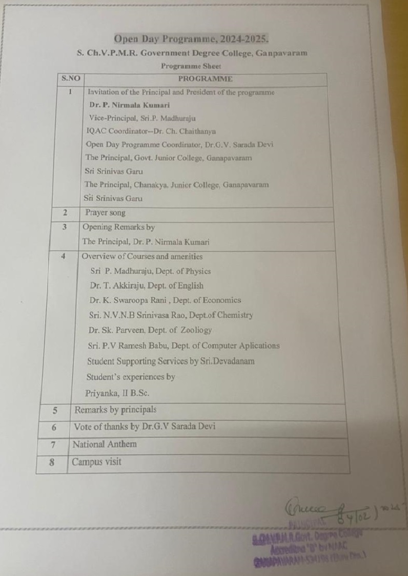 Government Degree College, Ganapavaram, organized an Open Day on 05.02.2025, inviting students and faculty from Government Junior College and Chanakya Junior College, Ganapavaram to explore the campus, academic programs, and facilities. The event aimed to provide aspiring degree students with first-hand exposure to the college environment.