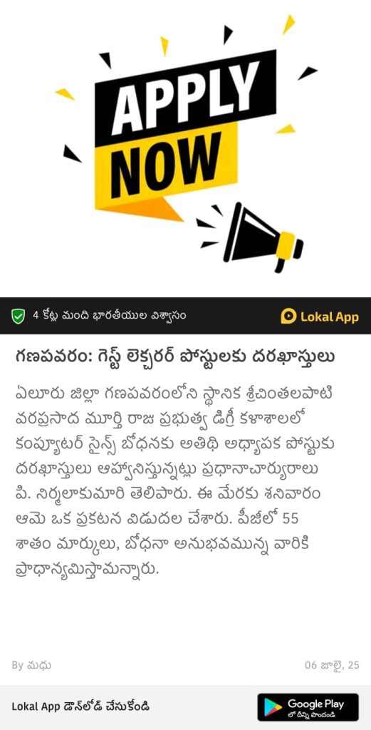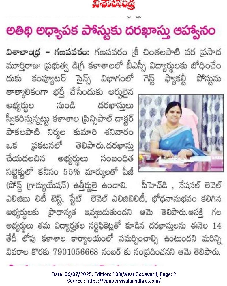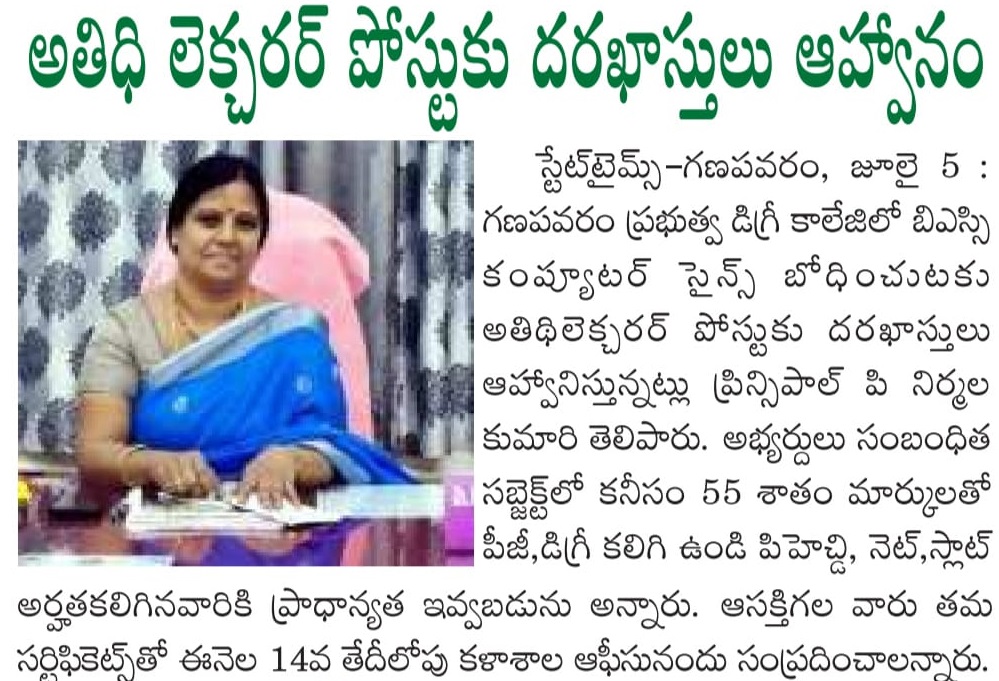 A press note issued by Dr. P. Nirmala Kumari, Principal, Government Degree College, Ganapavaram, invites applications from eligible candidates for the Guest Faculty position in the Department of Computer Science to teach B.Sc. students on a temporary basis. Applicants must have secured a minimum of 55% marks in the relevant PG subject. Preference will be given to candidates with Ph.D., NET/SET qualifications, or prior teaching experience.