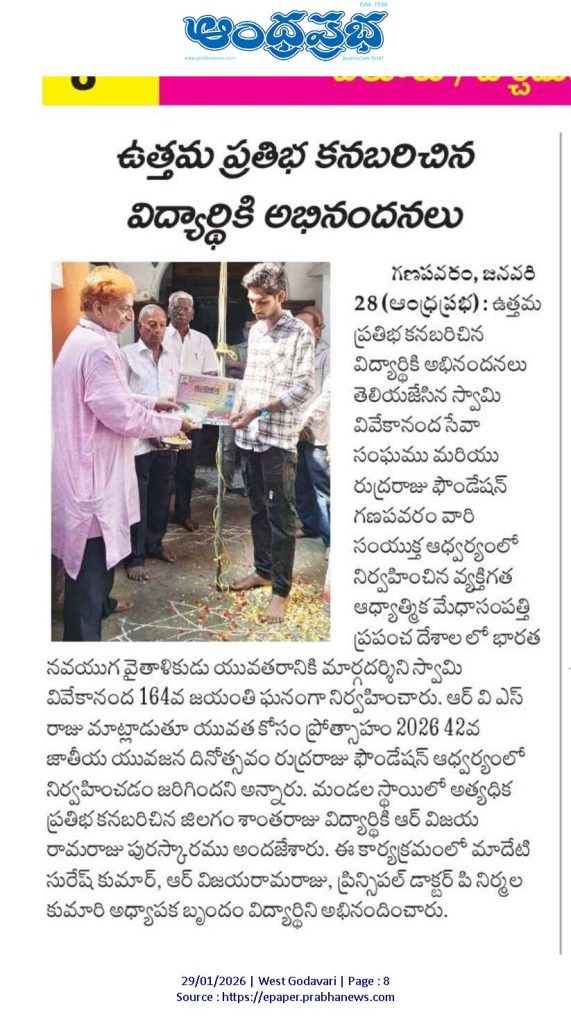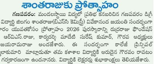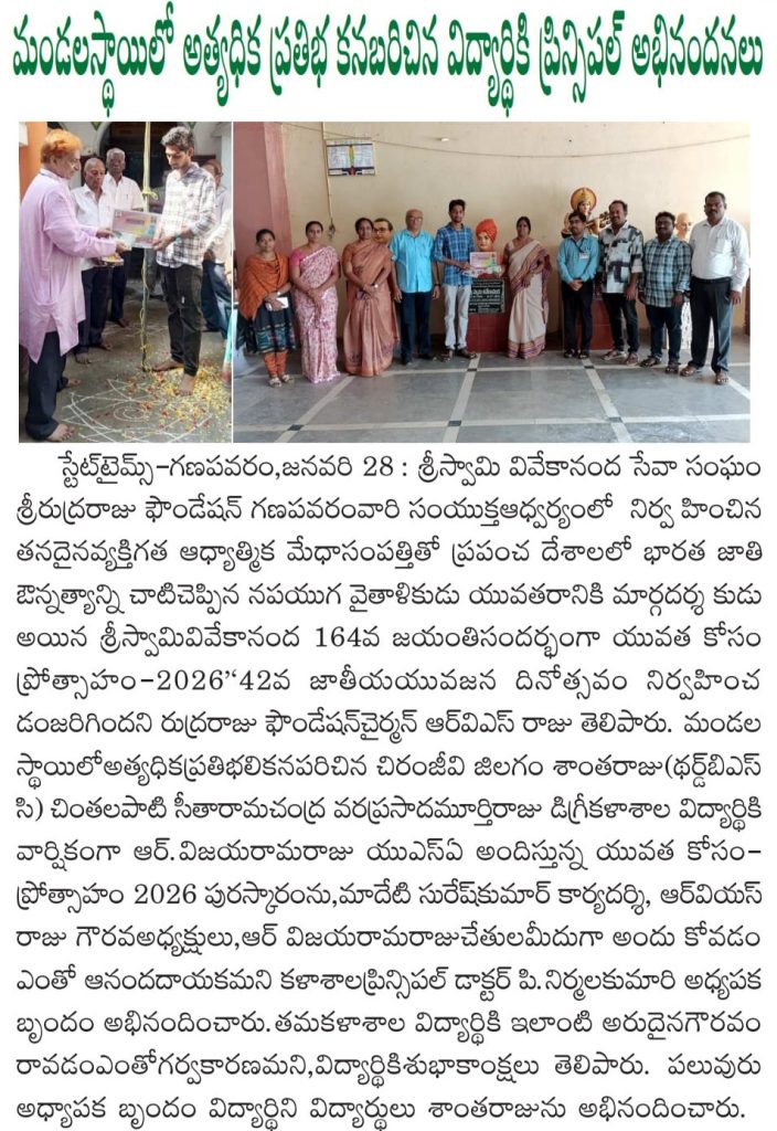 On the occasion of Swami Vivekananda’s Birth Anniversary, the Rudraraju Foundation Merit Student Award – 2026, instituted under the theme “Encouragement for Youth”, was presented to Sri Jilagam Santharaju, a student of III B.Sc (Honours) Chemistry, S.Ch.V.P.M.R. Government Degree College, Ganapavaram, in recognition of his outstanding academic performance and overall excellence on 26.01.2026.
