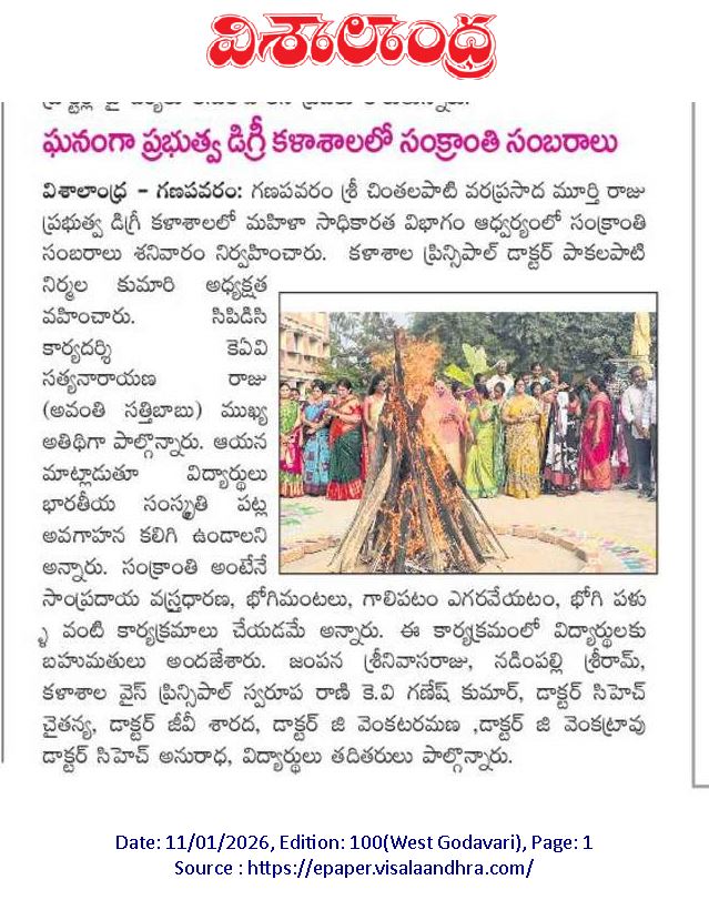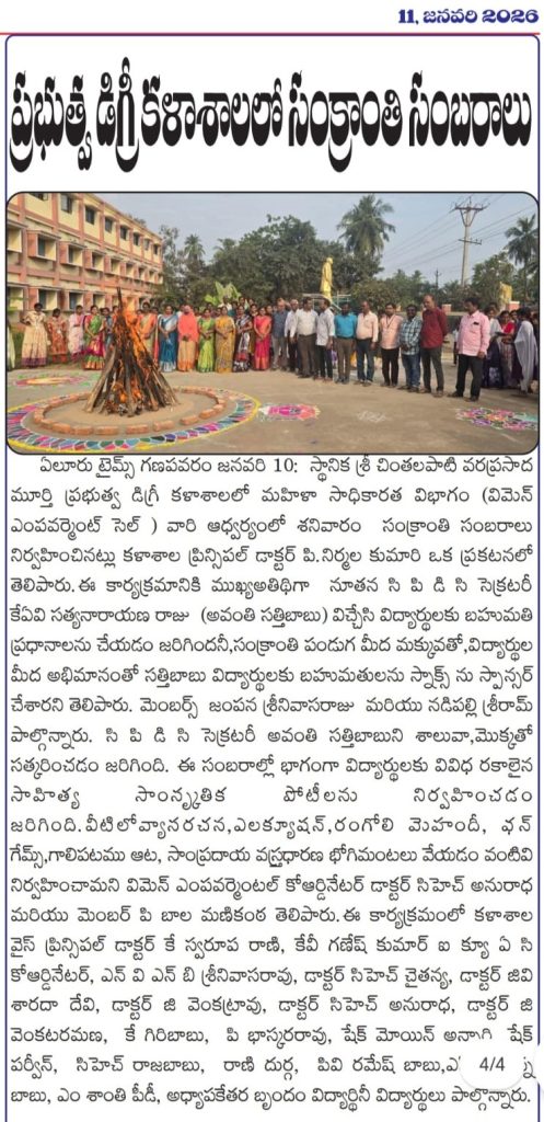 Sri Chintalapati Vara Prasada Murthy Raju Government Degree College, Ganapavaram celebrated “Sankranthi Sambaralu” with great enthusiasm and traditional fervor under the aegis of the Women Empowerment Cell on 09.01.2026. The programme aimed to promote Indian cultural values, unity, and student participation through festive activities.