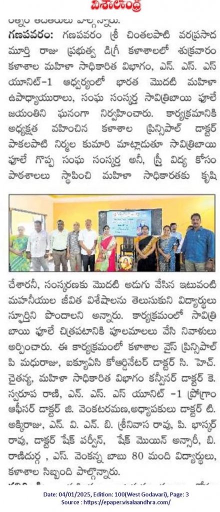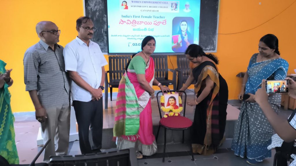Dr. P. Nirmala Kumari, Principal of the college, presided over the event and elaborated on the life of Savitribai Phule. She encouraged students to read the biographies of such great individuals to draw motivation from their lives.