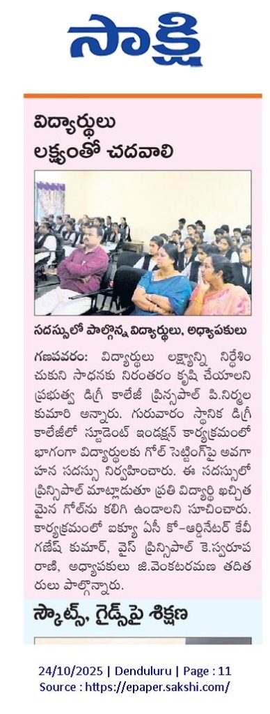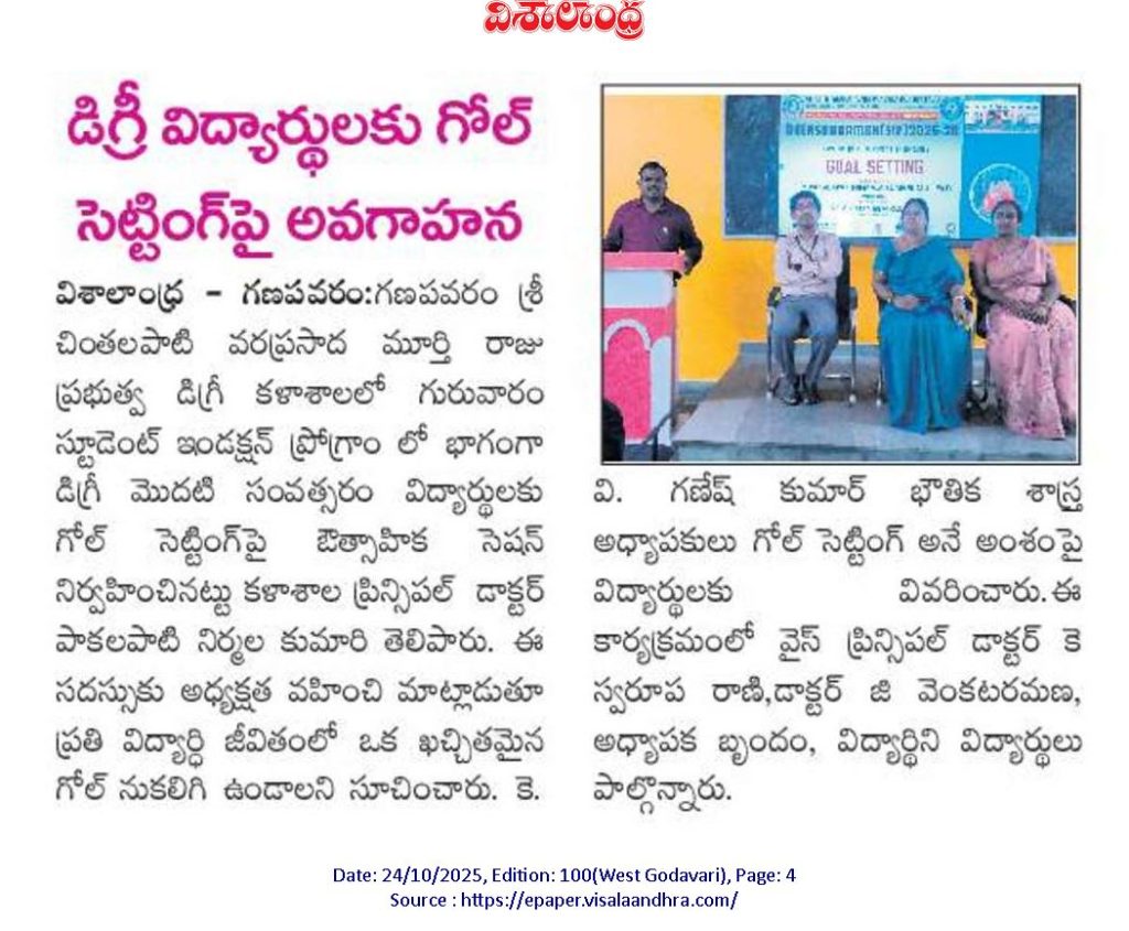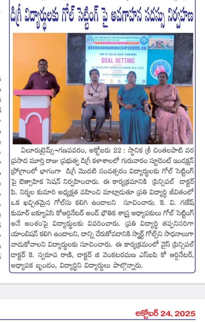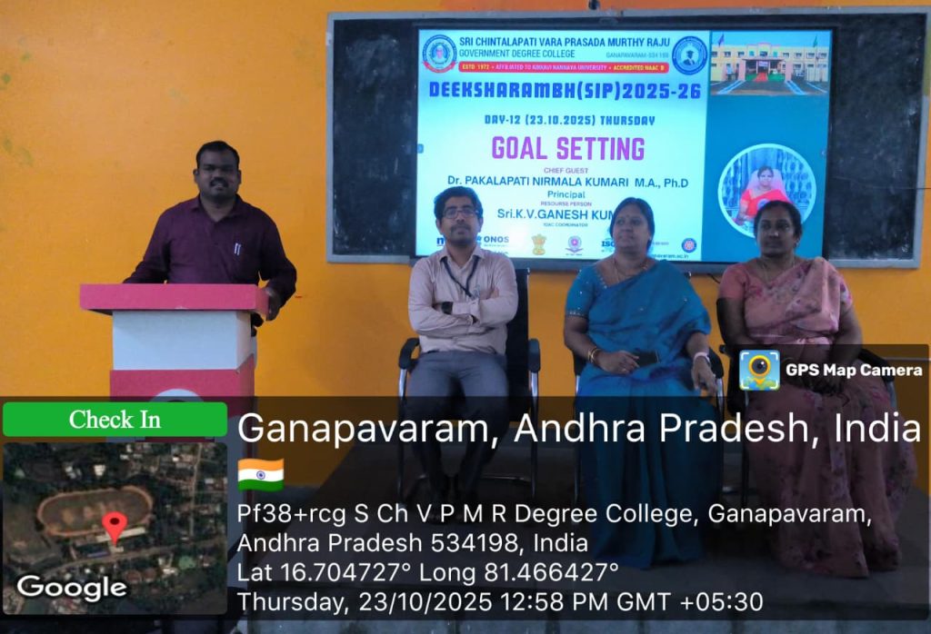 On 23rd October 2025, a motivational session on “GOAL SETTING” was organized for first-year degree students at S.CH.V.P.M.R. Government Degree College, Ganapavaram as part of the Student Induction Programme.