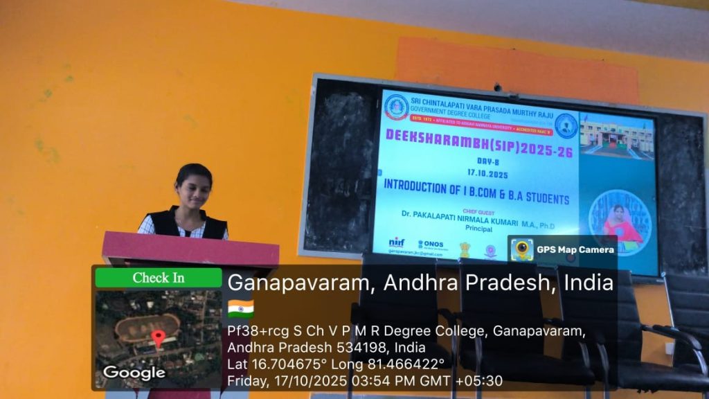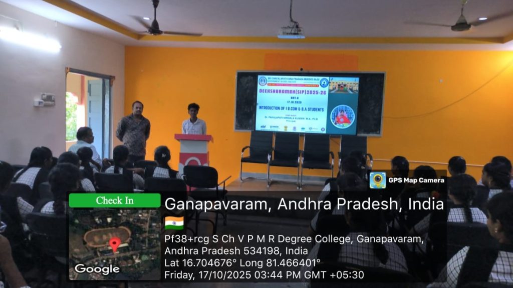 On 17th October 2025, the Student Induction Programme for the newly admitted I B.Com, CA, and B.A students was conducted at S.CH.V.P.M.R. Government Degree College, Ganapavaram. The day featured self-introduction by each student, creating a warm and interactive environment for the new batch to get acquainted with their peers and faculty.