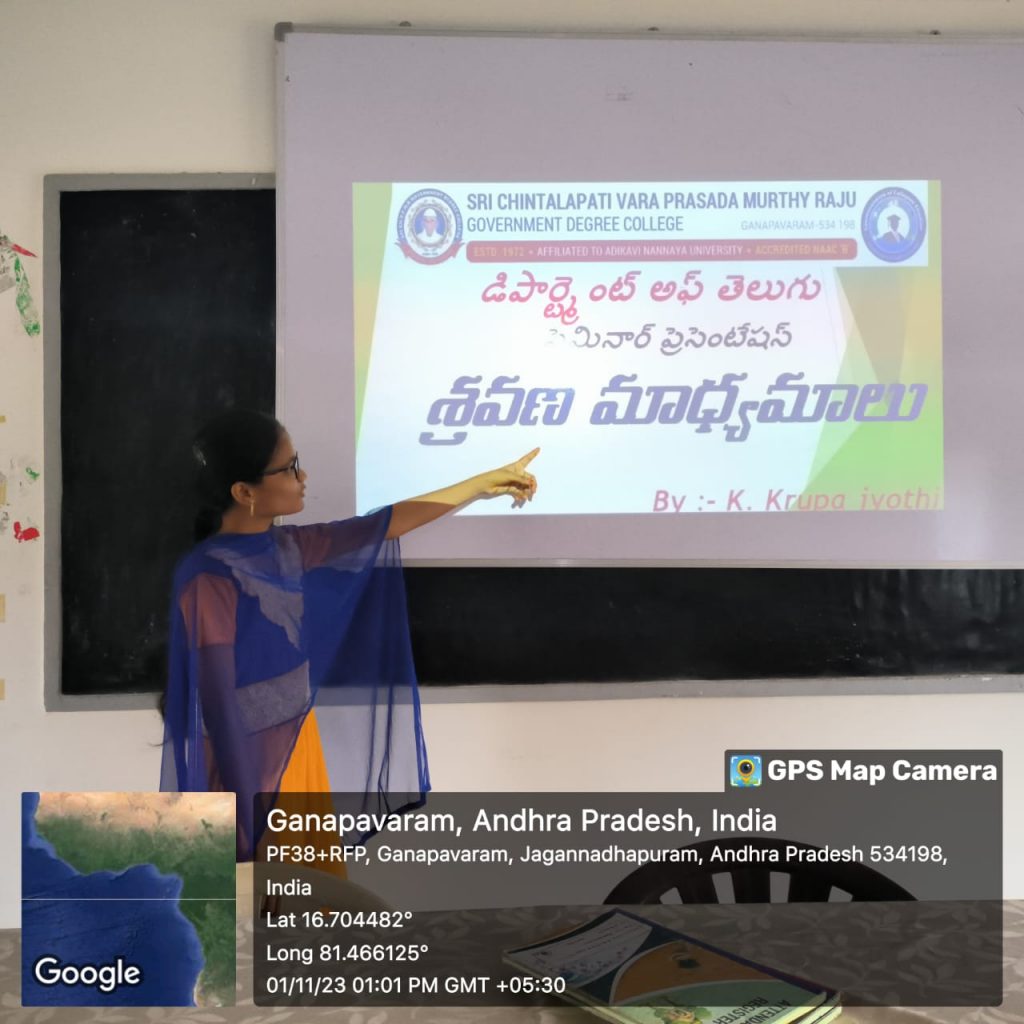 ఈ రోజు తెలుగు శాఖ ఆధ్వర్యంలో బికాం జనరల్ అండ్ కంప్యూటర్ అప్లికేషన్ ద్వితీయ సంవత్సరం విద్యార్థులు మూడవ సెమిస్టర్ లోని వివిధ పాఠ్యాంశాలపై స్మార్ట్ క్లాస్ రూమ్ లో పవర్ పాయింట్ ప్రజెంటేషన్ ఇవ్వడం జరిగింది. అపరంజిత శ్రావణమాధ్యమాలు, హర్షిత వాక్యంలోని రకాలు, కే. దుర్గ వార్తాంశాలు వార్త లక్షణాలు, జై శ్రావణి అనువాద సమస్యలు పరిష్కార మార్గాలు, కృపా జ్యోతి శ్రవణ మాధ్యమాలు అనే అంశాల మీద ప్రజెంటేషన్ ఇవ్వడం జరిగింది.
