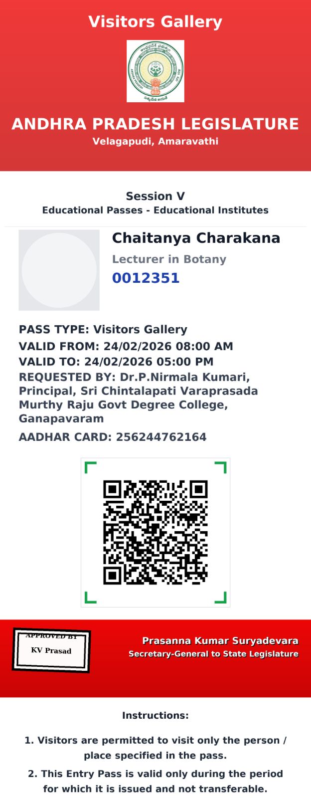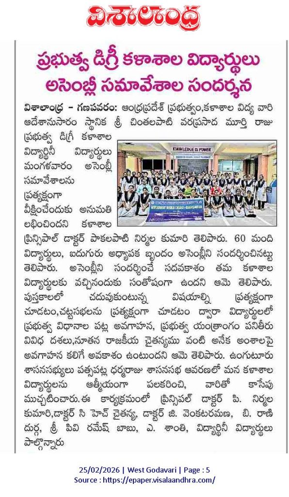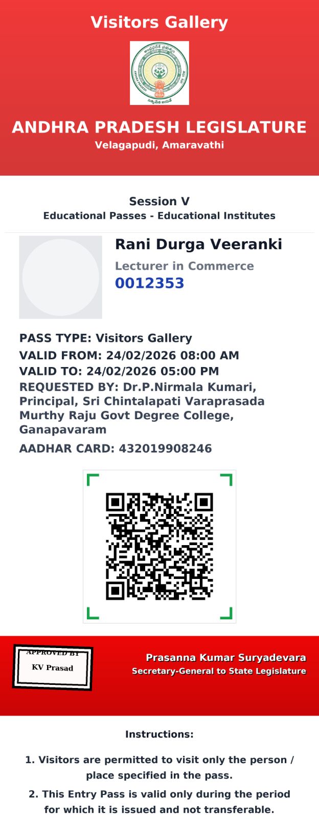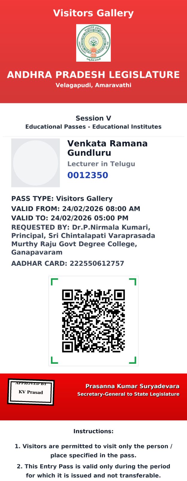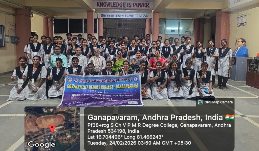 As per the proceedings of the Commissionerate of Collegiate Education, Andhra Pradesh, students of S.Ch.V.P.M.R. Government Degree College, Ganapavaram were given the opportunity to witness the live sessions of the Andhra Pradesh Legislative Assembly (APLA) and the Andhra Pradesh Legislative Council (APLC) at the Assembly Buildings, Velagapudi, Amaravati on 24.02.2026.