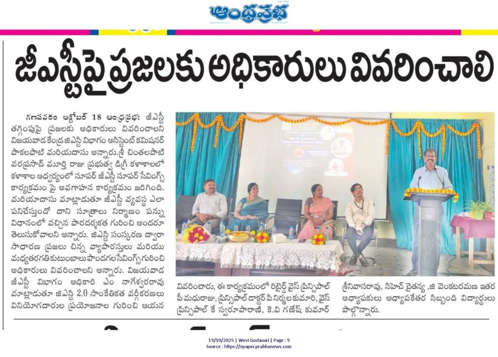 The Chief Guest, Sri Pakalapati Mariya Das, IRS, Assistant Commissioner, Central Tax and Customs, Vijayawada, explained in detail how the GST system functions, its structure, and how the reforms lead to super savings for households, small businesses, and the middle class. He encouraged students to understand GST not merely as a tax system but as a nation-building reform that promotes accountability, transparency, and self-reliance.