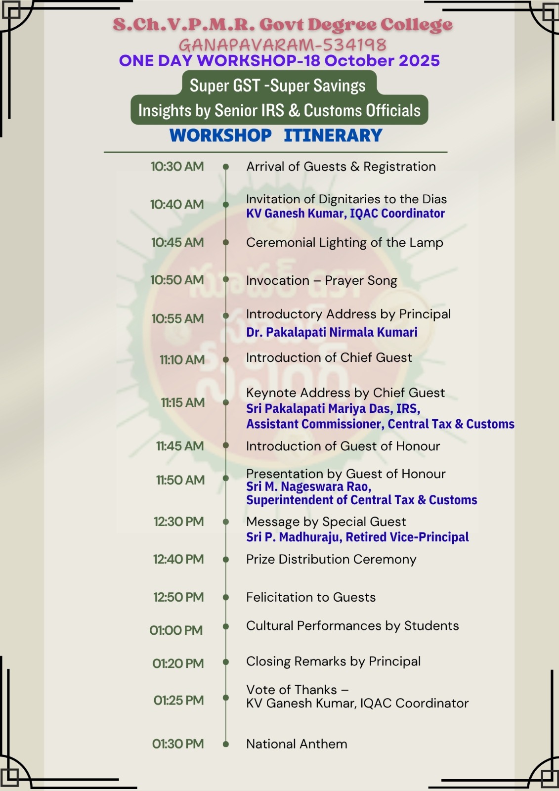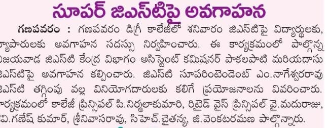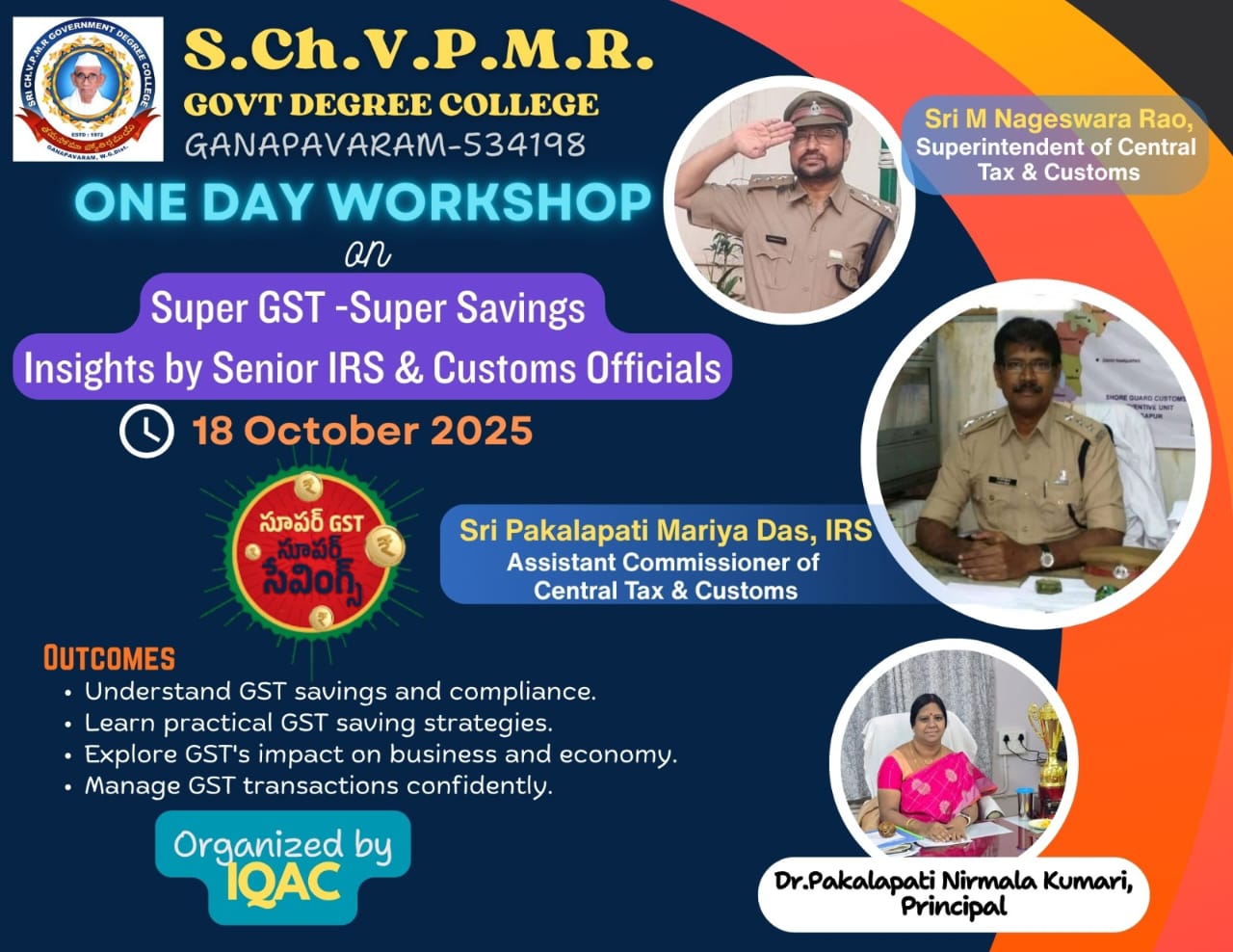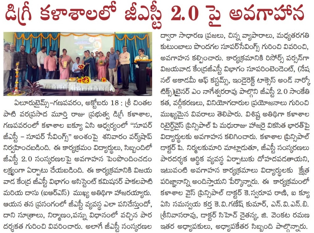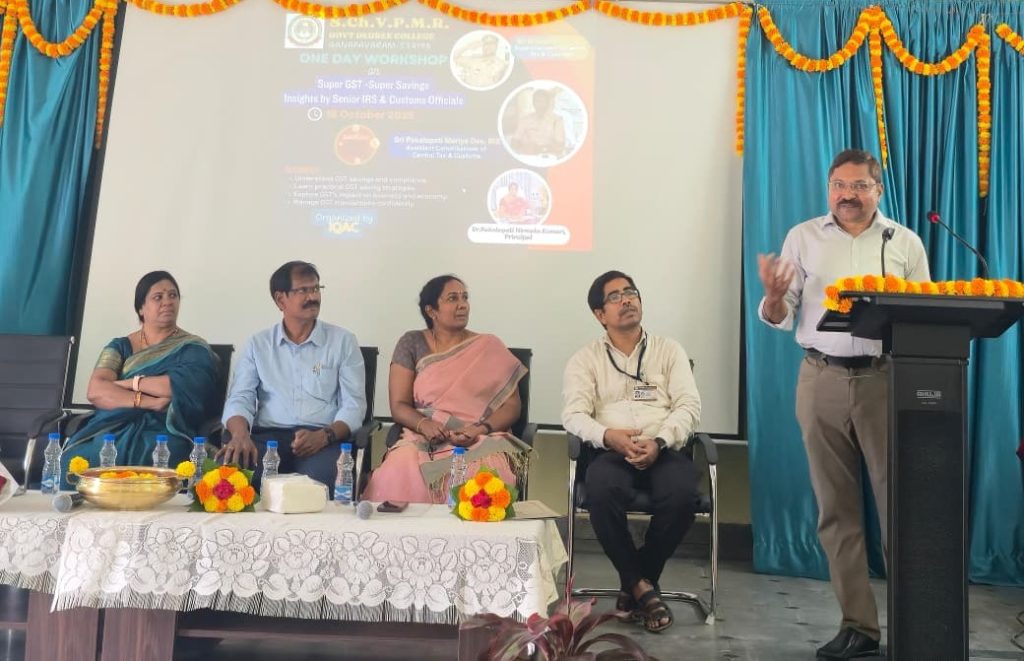 The Internal Quality Assurance Cell (IQAC) of S.CH.V.P.M.R. Government Degree College, Ganapavaram, successfully organized a One-Day Workshop on “Super GST – Super Savings” on 11th October 2025. The program aimed to create awareness among students and faculty about the GST 2.0 reforms, their significance, and the benefits they bring to the common man and small businesses.
