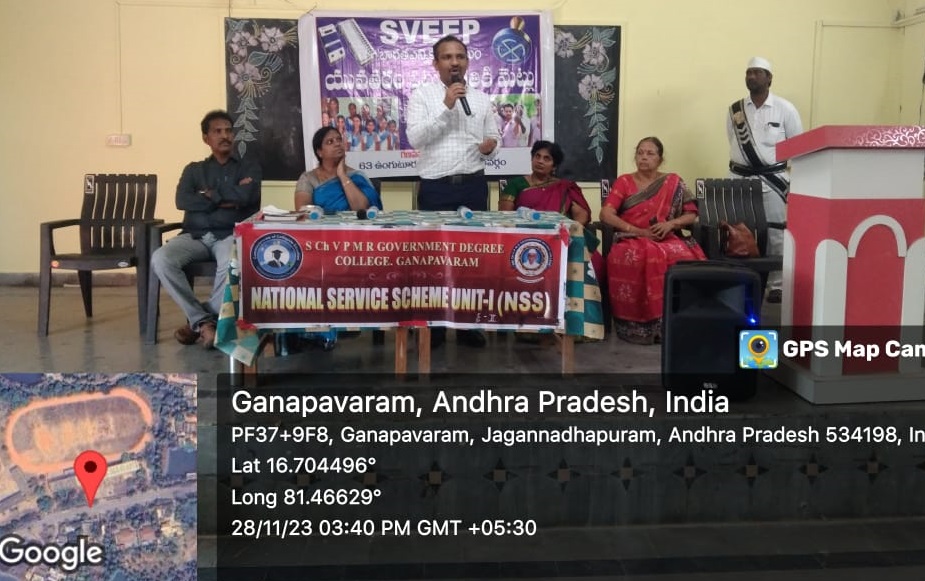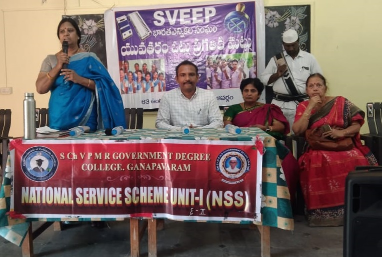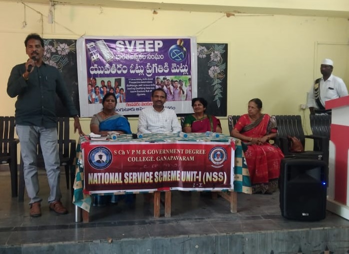 Voter Awareness Programme entitled Systematic Voters’ Education and Electoral Participation (SVEEP) is organized by NSS Units of the institution in collaboration with Mandal Revenue Office, Ganapavaram to carry out voters enrollment and to promote voter literacy. Revenue Divisional Office, Eluru Sk.Kajavali and MRO, Ganapavaram Smt PNVSS Lakshmi addressed the voters.