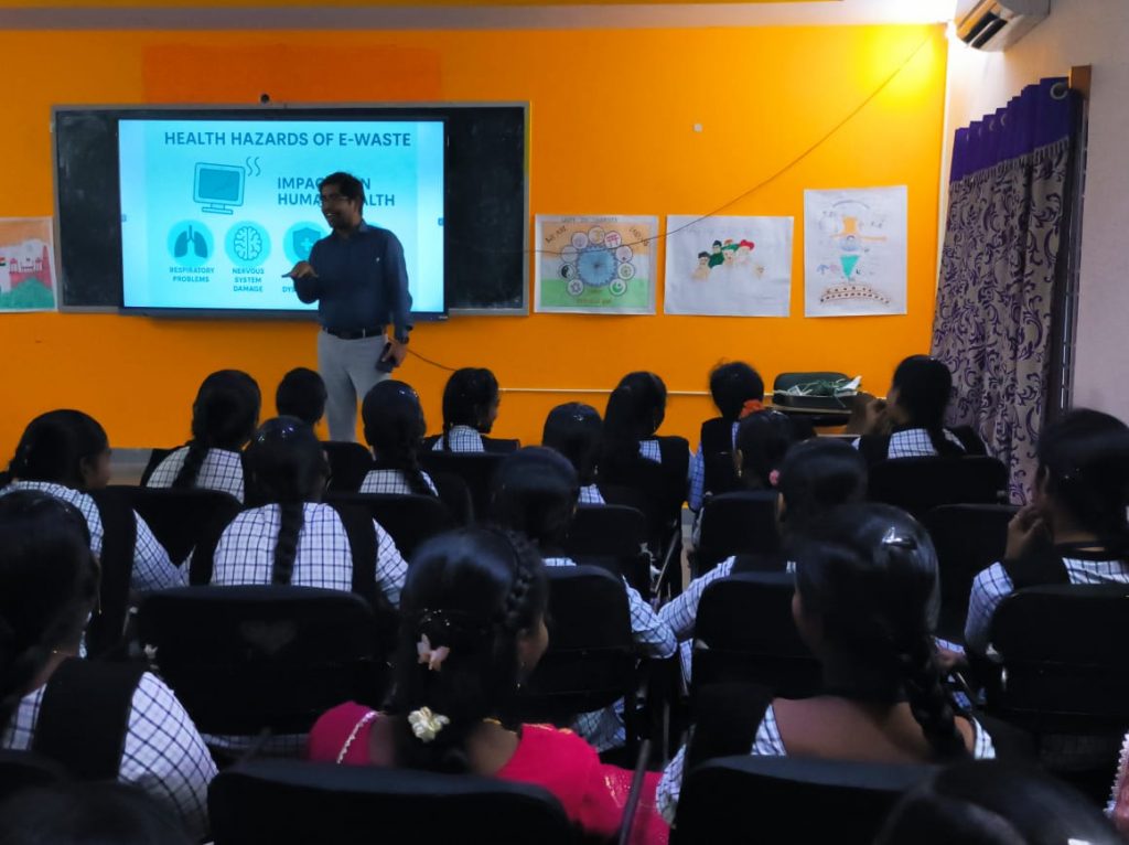The seminar featured Sri K.V. Ganesh Kumar, Lecturer in Physics, as the resource person, who delivered an informative session on the sources, risks, and management of e-waste. He emphasized the need for individual responsibility in reducing electronic waste and adopting sustainable technological practices.