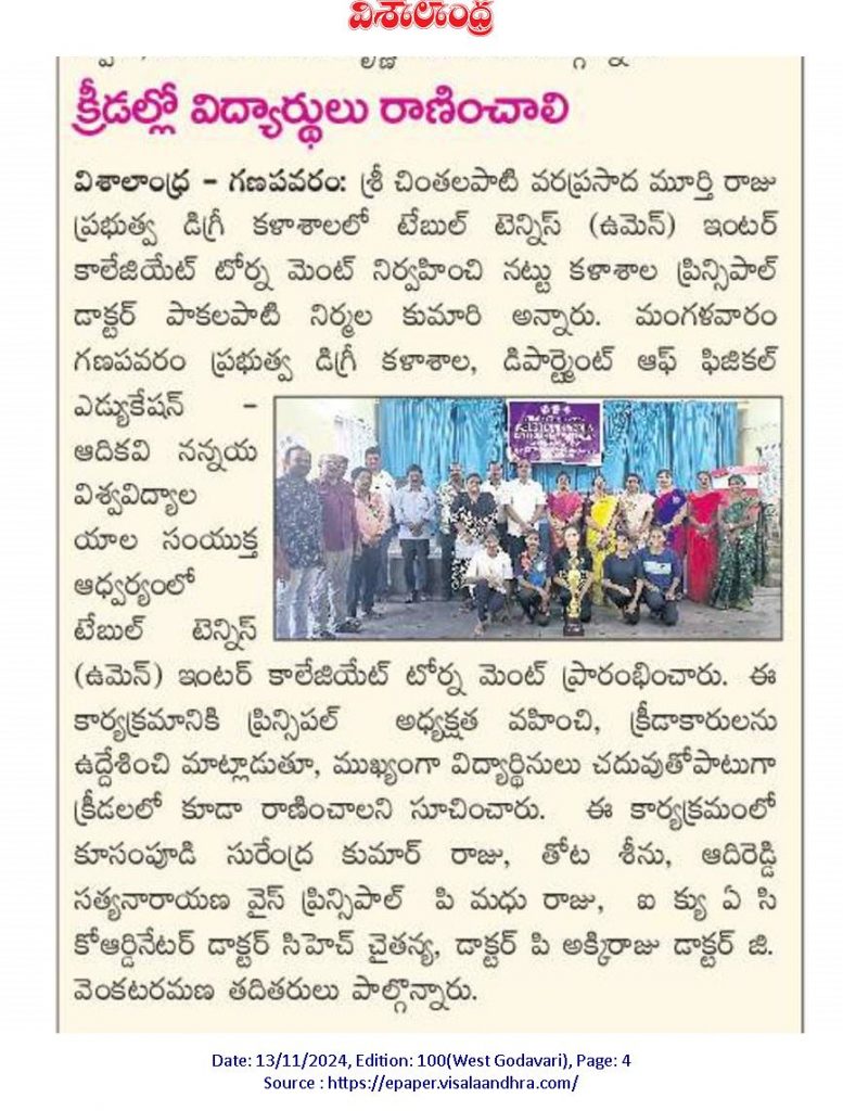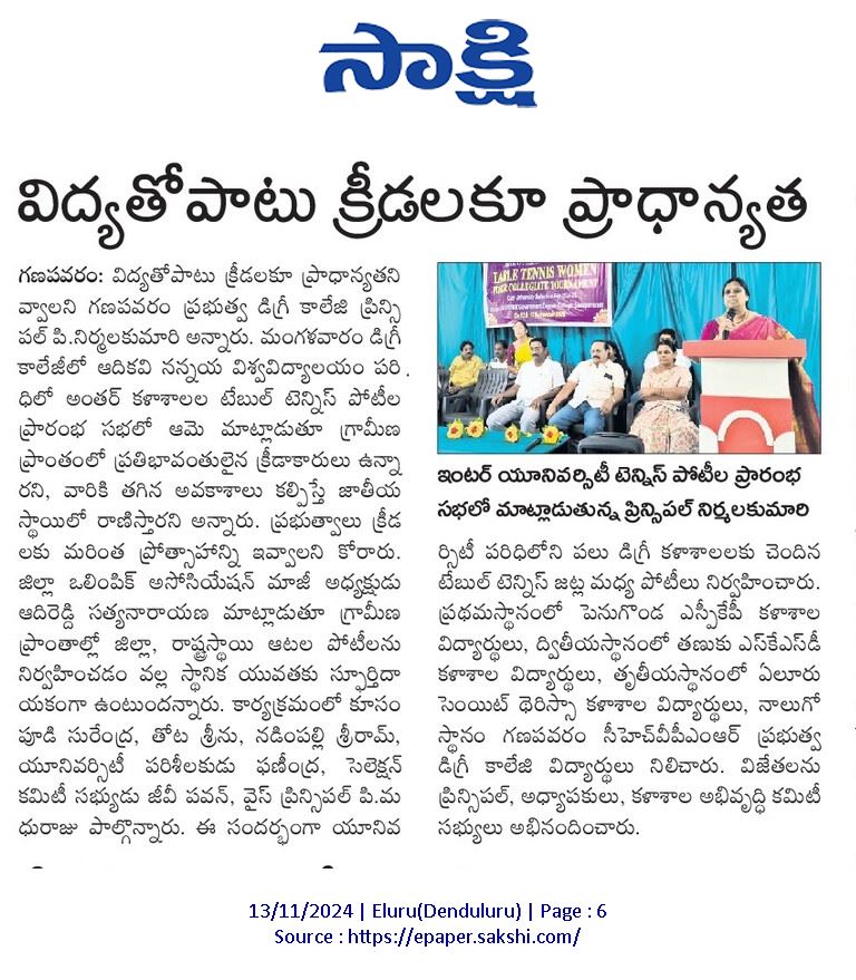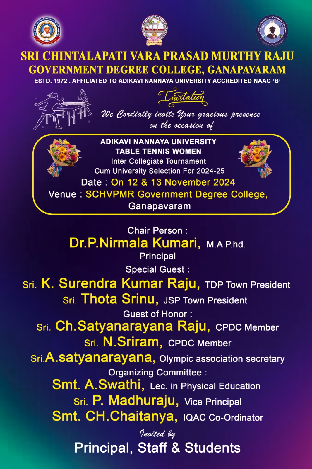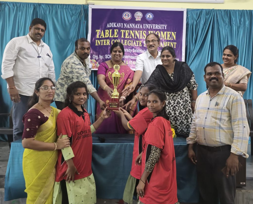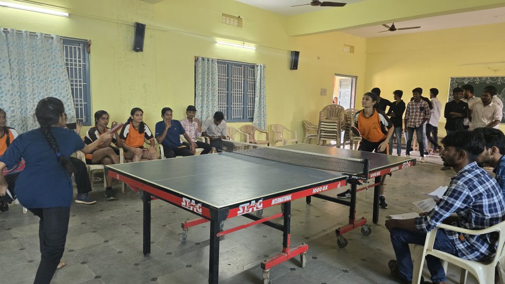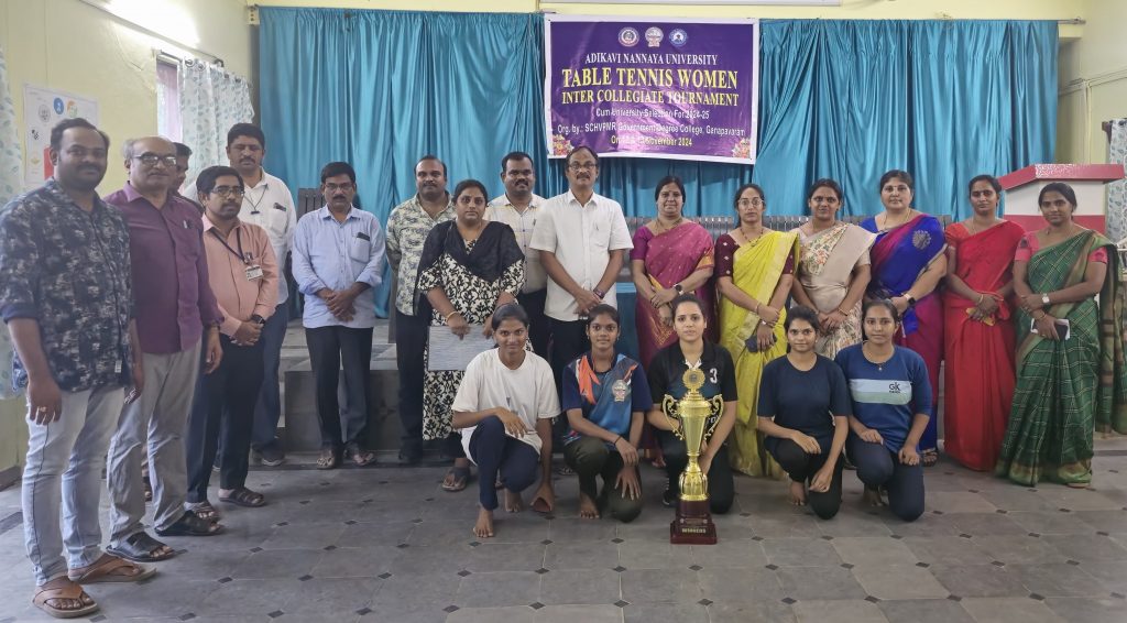 The Department of Physical Education in collaboration with Adikavi Nannaya University, hosted the Women’s Inter-Collegiate Table Tennis Tournament on 12.11.2024. The event was inaugurated under the guidance of Principal Dr. P. Nirmala Kumari, who emphasized to the players the importance of excelling in sports alongside academics, especially for women students, and conveyed her best wishes to the participants from various colleges. Physical Director Smt. A. Swathi coordinated the event.