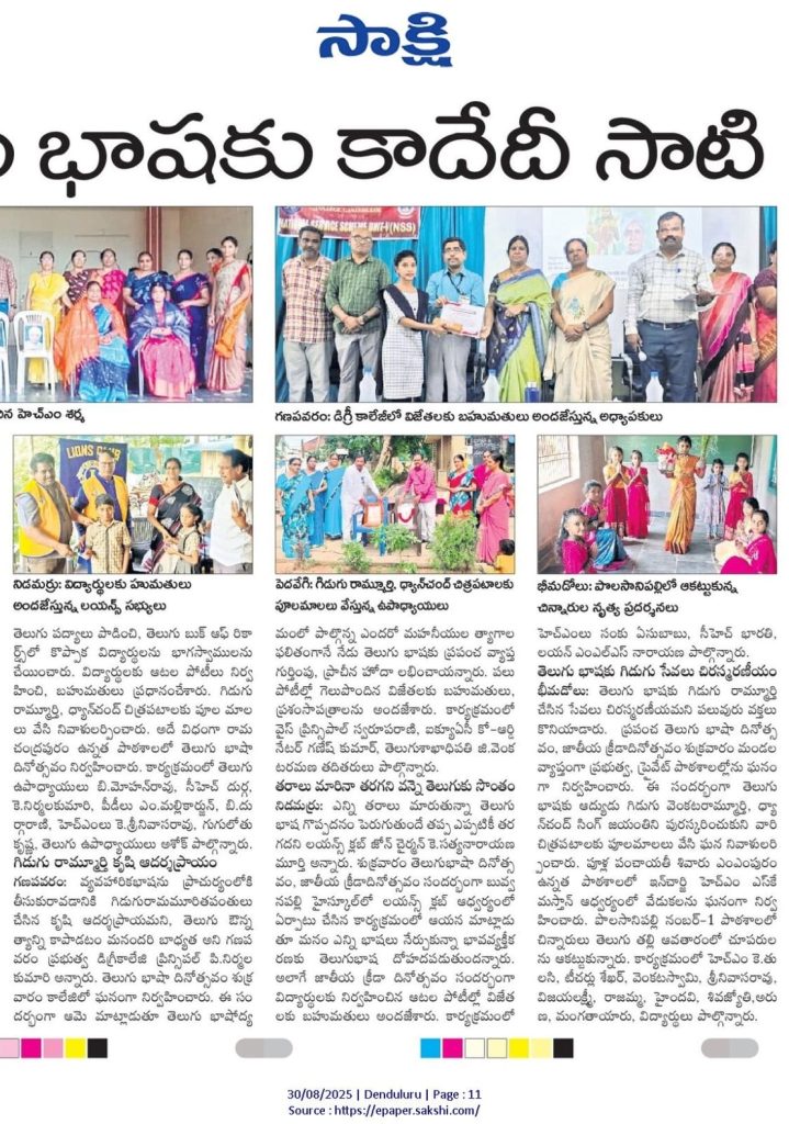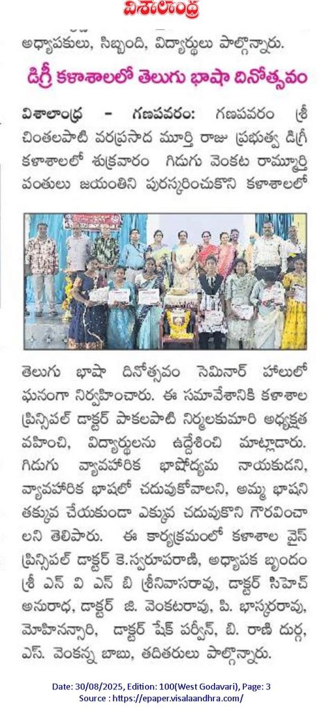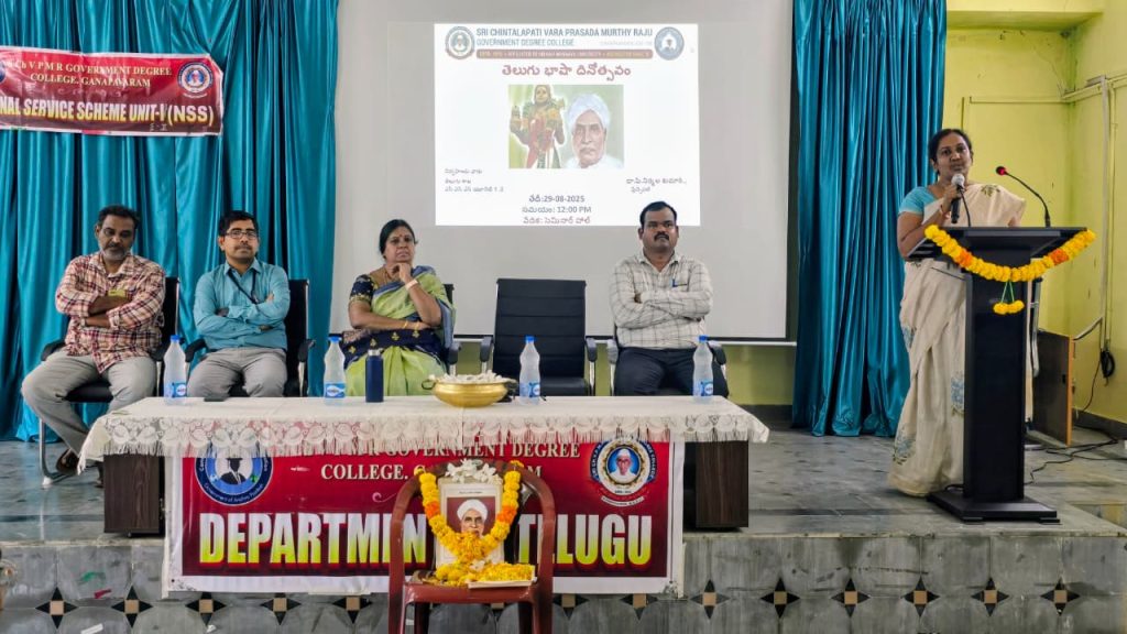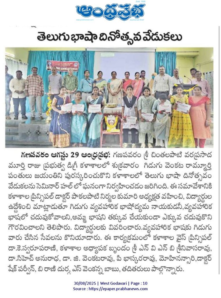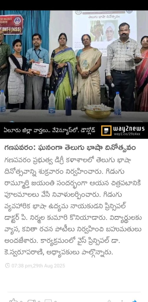 Government Degree College, Ganapavaram, celebrated Telugu Basha Dinotsavam on 29.08.2025 to mark the birth anniversary of Gidugu Venkata Ramamurthy, the pioneer of modern Telugu language reform.