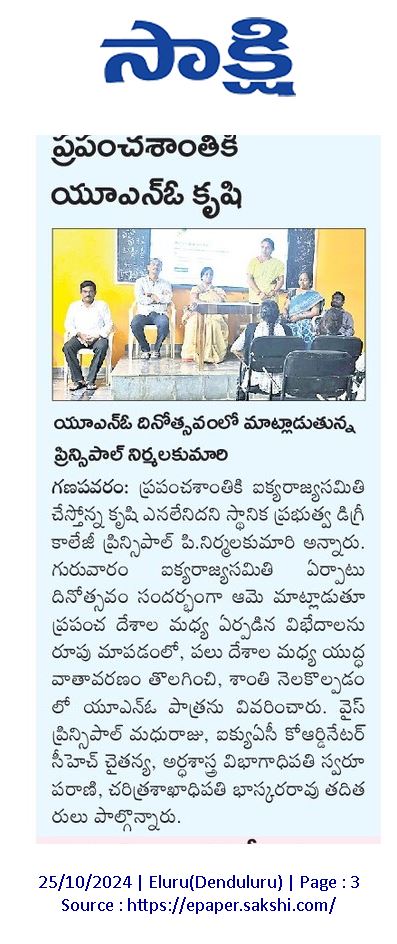 GDC Ganapavaram celebrated UNO Formation Day on October 24, 2024, highlighting the importance of global unity and cooperation. Principal Dr. P. Nirmala Kumari appreciated the enthusiastic participation of students and highlighted the relevance of understanding international organizations like the UN in today’s interconnected world. The event was coordinated by Sri P. Bhaskararao, Lecturer in History, who spoke on the origins and objectives of the United Nations, emphasizing its role in promoting peace, security, and sustainable development worldwide. Vice Principal Sri P. Madhu Raju, and IQAC Coordinator Dr. Ch. Chaitanya were present, underscoring the importance of global unity and the role of international organizations in fostering world peace.