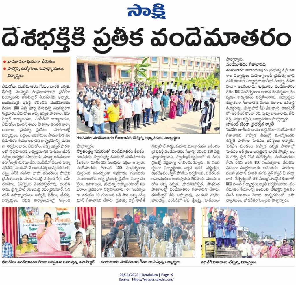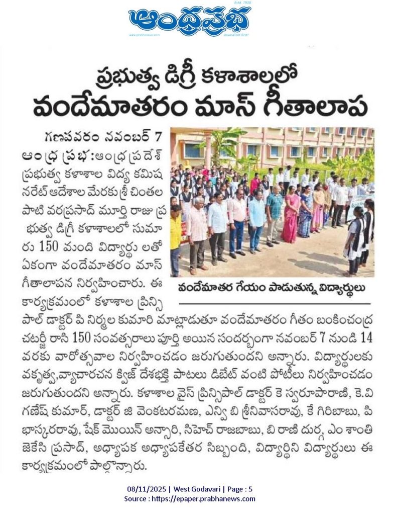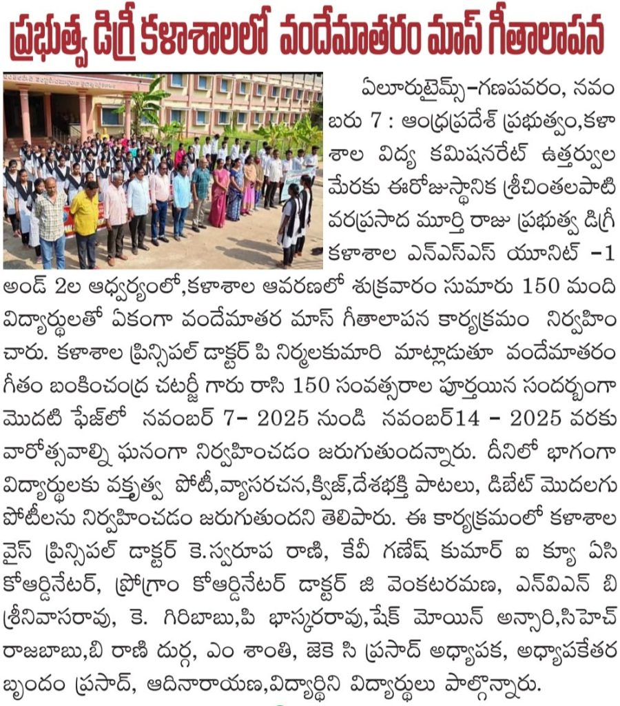 To commemorate 150 years of the National Song “Vande Mataram”, S. Ch. V. P. M. R. Government Degree College, Ganapavaram initiated a week-long celebration from 7 to 14 November 2025, following the guidelines of the Commissionerate of Collegiate Education, Andhra Pradesh.
