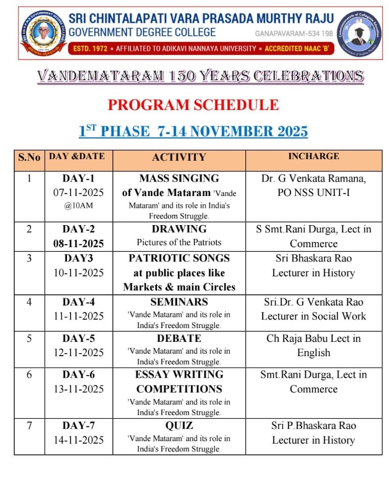 To commemorate 150 years of the National Song “Vande Mataram”, S. Ch. V. P. M. R. Government Degree College, Ganapavaram initiated a week-long celebration from 7 to 14 November 2025, following the guidelines of the Commissionerate of Collegiate Education, Andhra Pradesh.