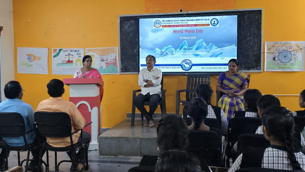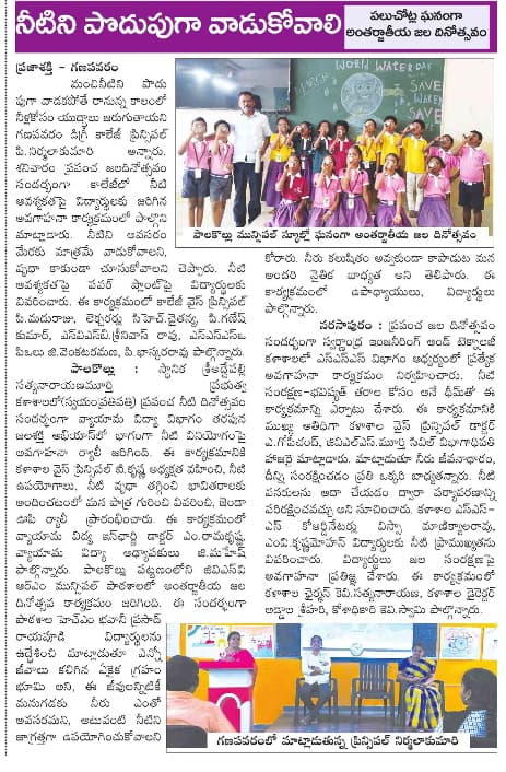 Principal Dr. P. Nirmala Kumari addressed the gathering, urging students to adopt water-saving practices in their daily lives. Vice-principal Sri P.Madhuraju and IQAC Coordinator Dr. Ch. Chaitanya emphasized the role of youth in promoting water conservation initiatives. Faculty members and students actively participated, making the program impactful and informative.