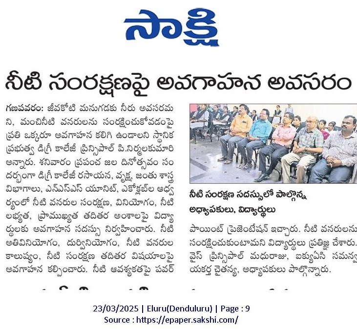 Government Degree College, Ganapavaram, solemnly observed World Water Day on 22.03.2025, highlighting the critical importance of water conservation and sustainable usage. The event was collaboratively organized by the Departments of Chemistry, Botany, Zoology, NSS Units, and the Eco Club.