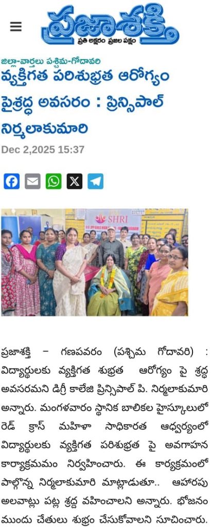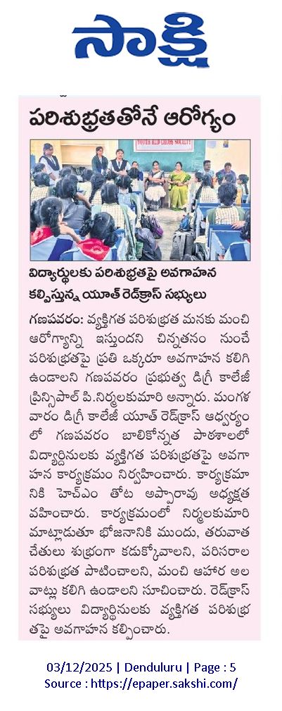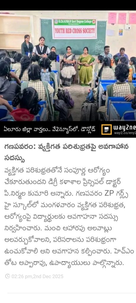 The Youth Red Cross (YRC), in collaboration with the Women Empowerment Cell, of S. Ch. V.P.M.R. Government Degree College, Ganapavaram, conducted an Awareness Programme on Health and Hygiene at ZPPH Girls High School, Ganapavaram on 01 December 2025.